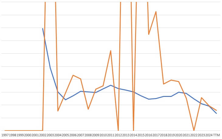 개별기업을 투자할 때도 ‘기하급수의 저주’는 투자자를 괴롭힌다. 데이터를 살피다가 알게 된 것인데 아마도 2025년이 처음으로 아마존(AMZN) 매출이 전통 유통의 강자 월마트(WMT) 매출을 추월하는 해가 되지 않을까 싶다. 파란색 코스트코(COST)는 무려 46년 CAGR 20%였고 월마트는 같은 기간 CAGR 15.5%로 성장했다. 그럼 아마존의 1996년부터 지금까지 연평균 성장률은 얼마나 될까?
